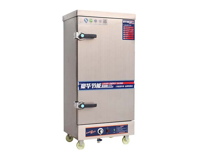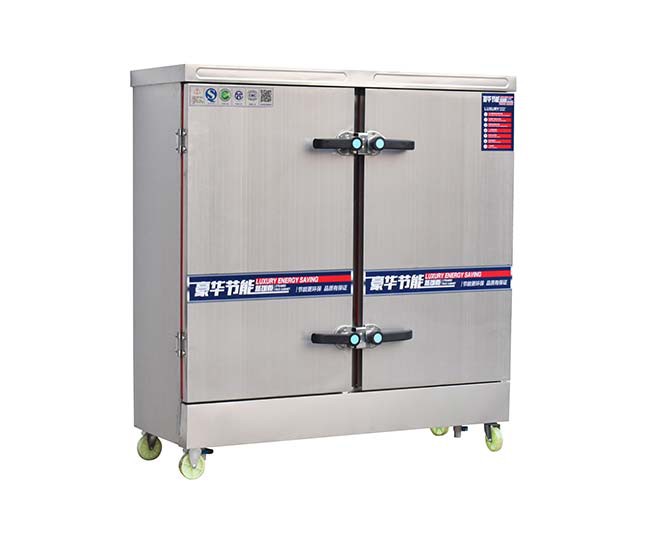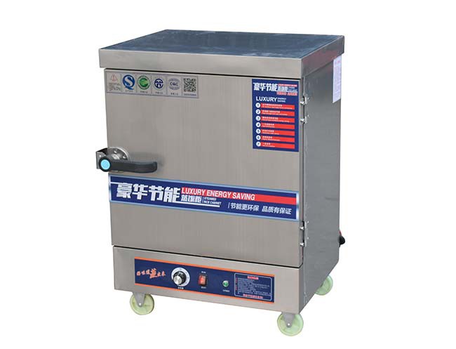 蒸饭柜又称蒸饭车、蒸饭机或蒸饭箱。是指利用电、燃气发热,蒸煮米饭的大型厨房烘烤设备。内部采用不锈钢蒸盘(不锈钢方盘)作为容器,为了方便移动,在设备下方安装有万向轮,故外形似车。车身为柜体状,材质为不锈钢所,一般多用304不锈钢制造。蒸饭车多用于酒店、部队、学校工厂等大型食堂。蒸饭车除了用来蒸米饭、馒头、包子以外,还可蒸猪肉、鸡鸭等肉食,还有专门用来蒸海鲜的海鲜蒸柜,也可以炖汤。